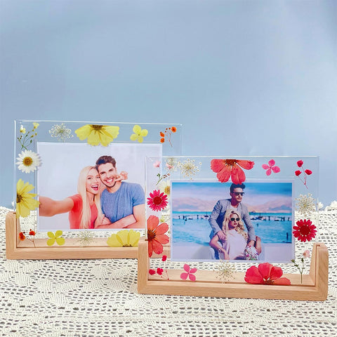 Dieser Fotorahmen hat zwei Sockel zur Auswahl, einen Holzsockel und eine transparente Basis.