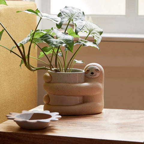 • Dale un poco de amor a tus plantas con esta jardinera de cerámica que presenta un perezoso súper acurrucado que le da un abrazo a tus plantas. En acabado moteado. Acabado con orificio de drenaje y tapón en la base.