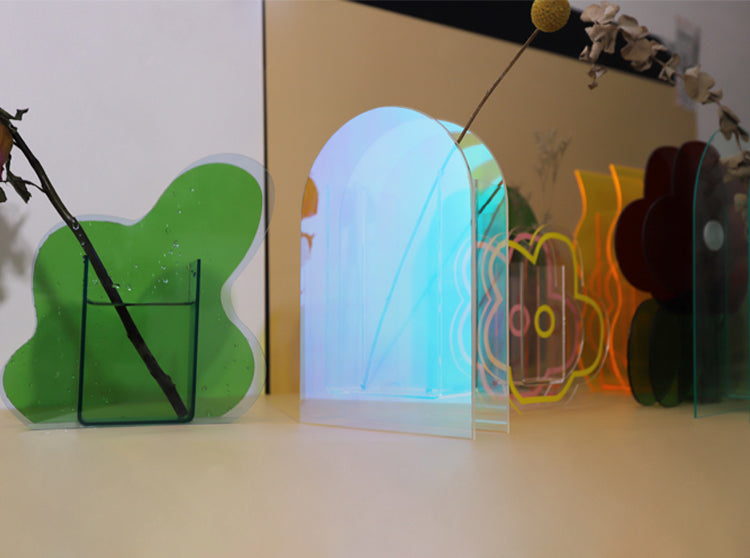Ce magnifique vase moderne utilise des panneaux de néon en acrylique transparent qui créent un jeu de couleurs ravissant et de belles ombres.